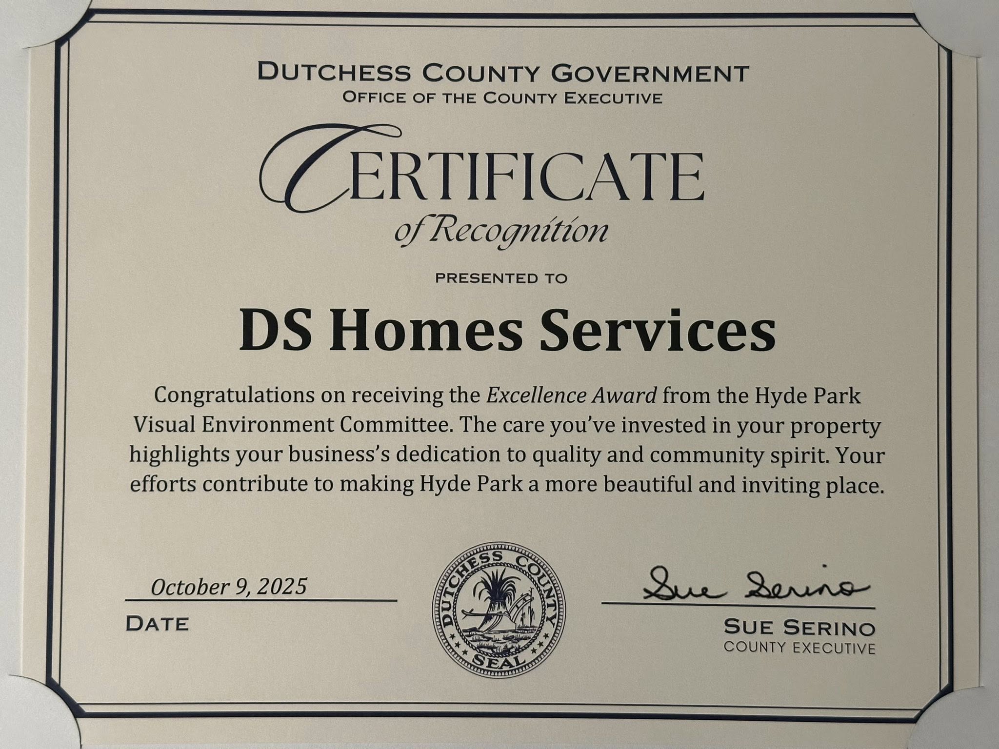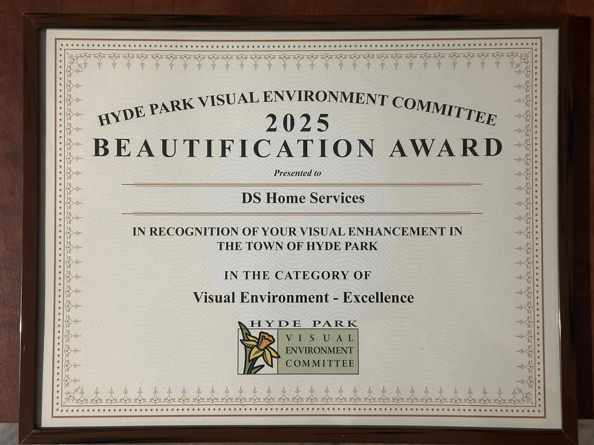 We’re honored to share that DS Home Services has been awarded the Hyde Park Visual Environment Committee‘s Beautification Excellence Award!